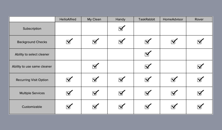 Through completing a competitive analysis, we deduced that the cleaning service industry is highly competitive and saturated. We were able to identify a select few opportunity gaps - the ability to select your own cleaner in addition to selecting your cleaning supply preference as a user. These were important because most competitors do not allow for these functionalities, and the desire for green-only products is an emerging trend in the cleaning industry. In addition to designing for our client’s website, they were also interested in any opportunity gaps in the marketplace that they could be taking advantage of.